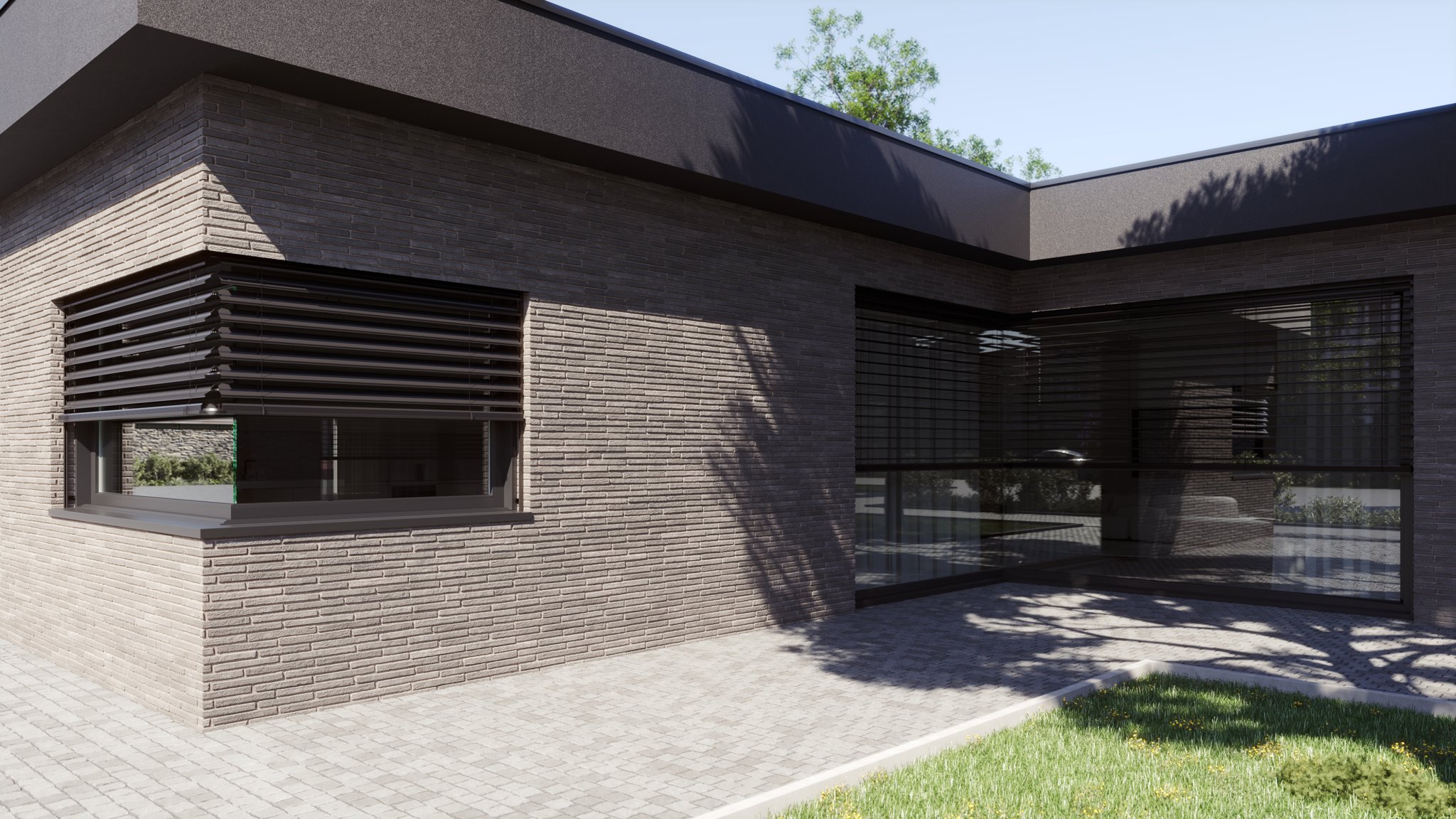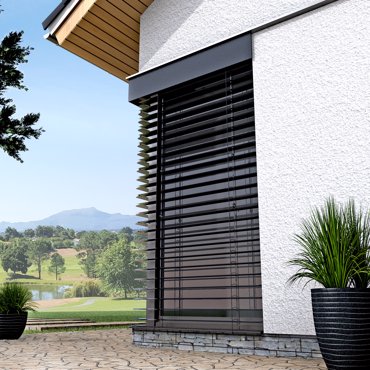 Rohová venkovní žaluzie ve spřaženém provedení je nejlepším řešením pro rohové portály domů a budov. Tento produkt mimo jiné řeší problém zastínění rohových oken bez toho, aniž by ve středu zůstávala vodící lišta a po vytažení žaluzie rušila celkový pohled z interiéru ven. Spojení lamel je realizováno nerezovým kuličkovým řetízkem v plastovém vodítku. Spojení profilů spodních lišt je provedeno kovovým úhlovým dílem zasunutým v plastovém rohu. Rohovou žaluzii lze použít pro vnější i vnitřní roh, avšak vždy pouze pro úhel 90°!